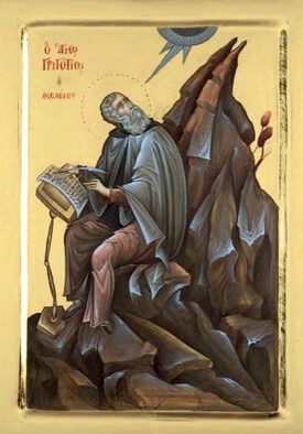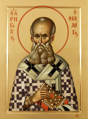 Богосло́вным язы́ком твои́м сплете́ния ри́торская разруши́вый, сла́вне,/ Правосла́вия оде́ждею, свы́ше истка́нною, Це́рковь украси́л еси́,/ ю́же и нося́щи, с на́ми зове́т твои́ми ча́ды:// ра́дуйся, о́тче, богосло́вия у́ме кра́йнейший.
