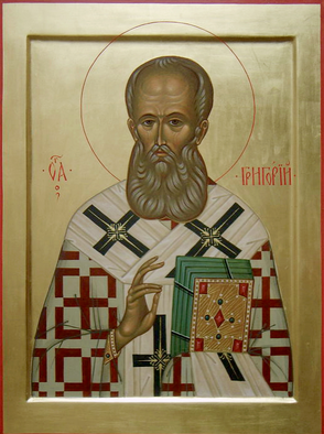 О, вели́кий и пресла́вный святи́телю Христо́в, всея́ Вселе́нския Це́ркве учи́телю богому́дрый, Правосла́вия тве́рдый испове́дниче и побо́рниче, преблаже́нне о́тче Григо́рие! При́зри от высо́т небе́сных на на́с, смире́нно к тебе́ припа́дающих, и умоли́ Го́спода Вседержи́теля, Его́же ве́рный на земли́ служи́тель бы́л еси́, да да́рует на́м ве́ры пра́выя тве́рдое и неизме́нное сохране́ние, Це́ркви Святе́й послуша́ние, жития́ на́шего исправле́ние, и во все́х ну́ждах, ско́рбех и искуше́ниих ско́рое поможе́ние, терпе́ние же и укрепле́ние. Пода́ждь на́м твое́ свято́е благослове́ние, да о́ным осеня́емии, сие́ но́вое ле́то, и во вся́ дни́ богоуго́дно, в ми́ре и покая́нии, поживе́м, и во Ца́рствии Небе́снем сподо́бимся ку́пно с тобо́ю и со все́ми святы́ми Живонача́льную Тро́ицу воспева́ти и сла́вити, Отца́ и Сы́на и Свята́го Ду́ха, во ве́ки веко́в. Ами́нь.