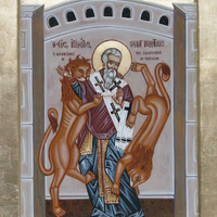 Светлых подвигов твоих светоносный день предвозвещает всем в пещере Рожденного, ибо желая насладиться Его любви, ты решился (на мученичество) быть съеденным зверями, потому и назвался Богоносцем, Игнатий премудрый.