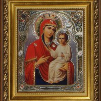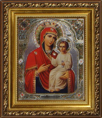 На иконе Пресвятая Богородица изображена держащей на левой руке Богомладенца, благословляющего десницей.