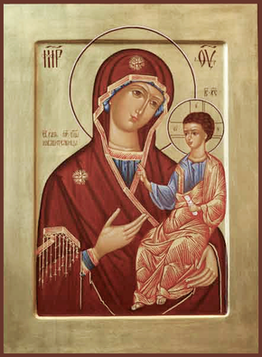 Велича́ем Тя,/ Пресвята́я Де́во,/ Богоизбра́нная Отрокови́це,/ и чтим о́браз Твой святы́й,/ и́мже то́чиши исцеле́ния // всем с ве́рою притека́ющим.