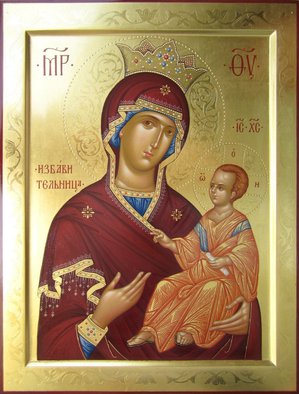 Избавле́ние Принося́щая всем,/ от се́рдца Тебе́ призыва́ющим,/ принеси́ избавле́ние ско́рое/ и нам, в лю́тых беда́х погиба́ющим // и в Тебе́ Едино́й избавле́ние на́ше на Бо́зе полага́ющим.