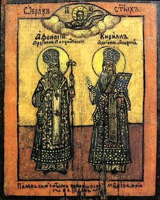 О, всехва́льный и пресла́вный святи́телю Афана́сие Вели́кий, за ве́ру Правосла́вную ты был еси́ в до́лзех труде́х, мно́зех по́двизех, в пятикра́тных изгна́ниих и бе́гствех, претерпе́л еси́ мно́ги клеветы́ и оболга́ния, мно́гажды за ню хоте́ша врази́ твои́ уби́ти тя, и то́кмо Сам Бог чуде́сно сохрани́ тя от сме́рти. И все сие́ ты претерпе́л еси́ от нечести́вых еретико́в – ариа́н, с ни́ми же и боро́лся еси́, и и́хже, в пучи́не слове́с погрузи́в, терпе́нием твои́м препобеди́л еси́, и, злове́рие их от Це́ркве отгна́в и правосла́вное уче́ние насади́в, умно́жил еси́ се́мя ве́ры Христо́вой. Вои́стинну ты еси́ хра́брый во́ин Христо́в, я́ко во́ин бо, до конца́ дний твои́х сла́вно боро́лся еси́ за пра́вую ве́ру со еретики́. Вои́стинну ты еси́ столп ве́ры Правосла́вныя, и́бо ника́коже поколеба́ся ве́ра твоя́ Правосла́вная от сих гоне́ний ерети́ческих, но па́че утверди́ся и укрепи́ся, и не то́кмо у тя и у па́ствы твое́й, но и во всей Це́ркви Христо́вой. К тебе́ мо́лимся, уго́дниче Бо́жий, испроси́ у Христа́ Бо́га на́шего и нам име́ти ве́ру непоколеби́му и не уклони́тися от пра́ваго пути́ ея́, но до конца́ дний свои́х пребы́ти на нем, не боя́щеся ни ле́сти, ни преще́ния, ни да́же гоне́ния, и унасле́довати Ца́рство Небе́сное во сла́ве Бо́га Отца́ и Сы́на и Свята́го Ду́ха, иде́же ты и вси святи́и пребыва́ют. Ами́нь.