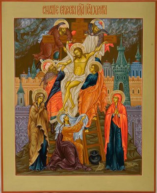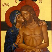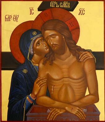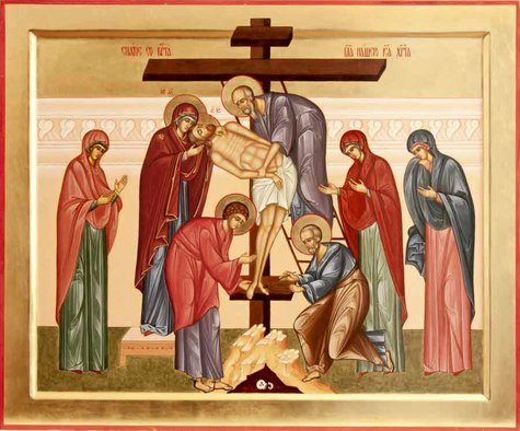 Благообра́зный Ио́сиф,/ с дре́ва снем пречи́стое Те́ло Твое́,/ плащани́цею чи́стою обви́в,// и воня́ми во гро́бе но́ве покры́в положи́.
