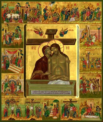 Перевод: Бездну Заключивший лежит пред нами мертвым, и, полотном со смирною обвитый, в гробнице полагается как смертный – Бессмертный. Жены же пришли помазать Его миром, плача горько и взывая: «Эта суббота – преблагословенна, та самая, когда Христос уснул, чтобы на третий день воскреснуть».