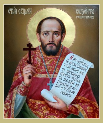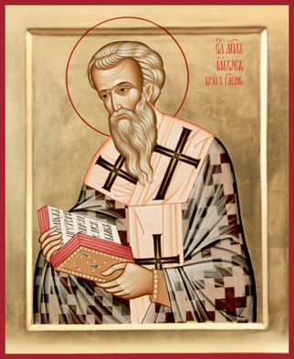 Я́ко Госпо́день учени́к, восприя́л еси́ пра́ведне, Ева́нгелие,/ я́ко му́ченик, и́маши е́же неопи́санное,/ дерзнове́ние я́ко бра́т Бо́жий,/ е́же моли́тися, я́ко иера́рх:// моли́ Христа́ Бо́га, спасти́ся душа́м на́шим.⚜⚜⚜