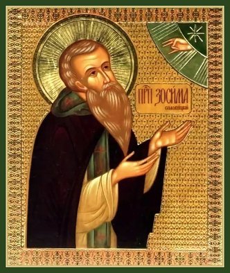 Изволе́нием Боже́ственнаго ра́зума/ всели́лся еси́ в пусты́ню,/ и та́мо, впери́в ум твой в Небе́сныя оби́тели,/ ра́вно А́нгелом житие́ на земли́ пожи́в,/ в моли́твах, и труде́х, и поще́ниих/ о́браз был еси́ твои́м ученико́м./ Отону́дуже Бог, ви́дя твое́ благо́е изволе́ние,/ умно́жи тебе́ ча́да в пусты́ни, слез твои́х тече́ньми напая́емей./ Но, я́ко име́я дерзнове́ние к Бо́гу,/ помина́й ста́до, е́же собра́л еси́, му́дре,/ и не забу́ди я́коже обеща́лся еси́,/ посеща́я чад твои́х,// Зоси́мо преподо́бне, о́тче наш.⚜⚜⚜