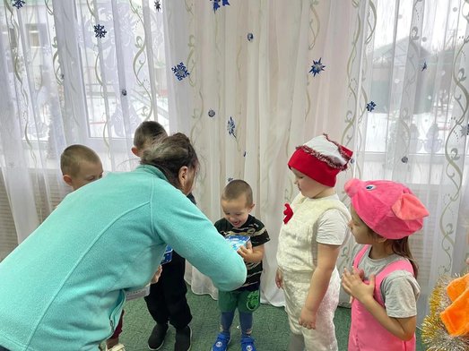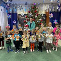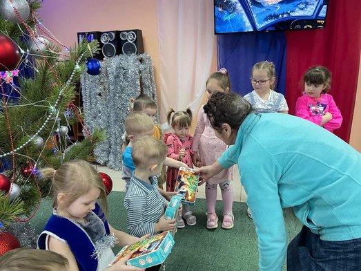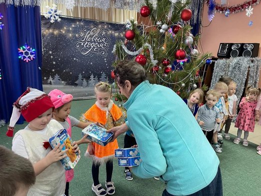 Казначей храма Смоленской Божией Матери станицы Шумилинской Любовь Пантелеймоновна Разогреева поздравила детей, воспитанников Детского сада и работников сего учреждения, от имени фонда Свет Ангела, пожелав им счастья, здоровья и помощи Божией и вручила сладкие подарки детям.