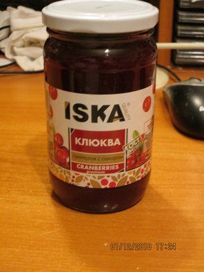 01 декабря 2018г., купил я в магазине «Верный» в Екатеринбурге вот эту баночку. Называется «Клюква, протёртая с сахаром». Производитель фирма «ISKA Quaity®», ООО «Шредер ритейл», 196247, Россия, Санкт-Петербург, Ленинский пр. 153, пом. 70Н. Изготовитель ООО «Петроконсерв», 199106, Россия, г. Санкт-Петербург, Линия Косая, д. 3, литер А, пом. 10Н. По ГОСТ Р 54681-2011. www.iska.ru. Состав: клюква, сахар-песок, регулятор кислотности: лимонная кислота. Масса нетто 420 г.