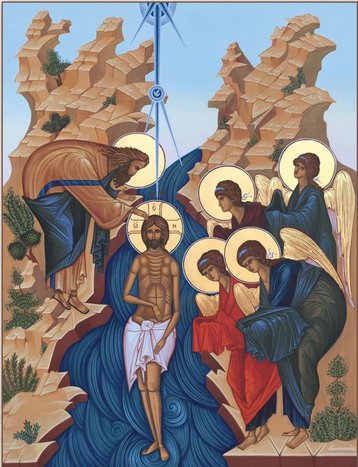 Возвраща́шеся иногда́ Иорда́н река́ ми́лотию Елиссе́евою, возне́сшуся Илии́, и разделя́хуся во́ды сю́ду и сю́ду и бысть ему́ сух путь, и́же мо́крый, во о́браз вои́стинну Креще́ния, и́мже мы теку́щее жития́ прехо́дим ше́ствие: Христо́с яви́ся во Иорда́не освяти́ти во́ды.