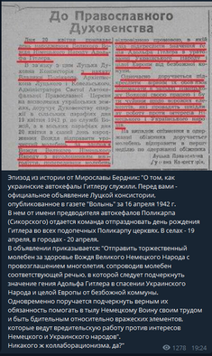 Эпизод из истории от Мирославы Бердник: "О том, как украинские автокефалы Гитлеру служили. Перед вами - официальное объявление Луцкой консистории, опубликованное в газете "Волынь" за 16 апреля 1942 г. В нем от имени предводителя автокефалов Поликарпа (...