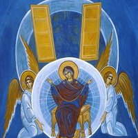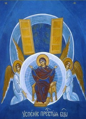 Прииди́те, вси концы́ земни́и,/ честно́е преставле́ние Богома́тере восхва́лим:/ в ру́це бо Сы́на ду́шу непоро́чную положи́./ Те́мже святы́м успе́нием Ея́ мир оживотвори́ся,/ во псалме́х, и пе́ниих, и пе́снех духо́вных/ со Безпло́тными и апо́столы пра́зднует све́тло.