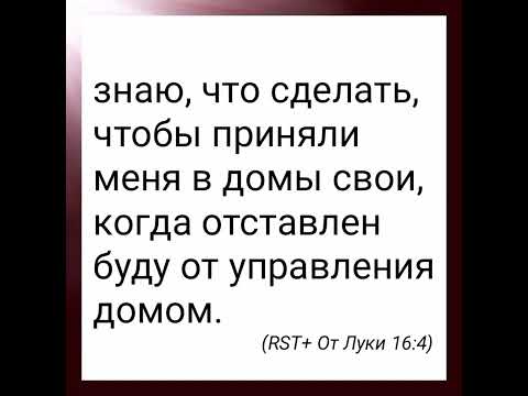 Сказал же и к ученикам Своим: один человек был богат и имел управителя, на которого донесено было ему, что расточает имение его; и, призвав его, сказал ему: что это я слышу о тебе? дай отчет в управлении твоем, ибо ты не можешь более управлять. Тогда управитель сказал сам в себе: что мне делать? господин мой отнимает у меня управление домом; копать не могу, просить стыжусь; знаю, что сделать, чтобы приняли меня в домы свои, когда отставлен буду от управления домом. И, призвав должников господина своего, каждого порознь, сказал первому: сколько ты должен господину моему? Он сказал: сто мер масла. И сказал ему: возьми твою расписку и садись скорее, напиши: пятьдесят. Потом другому сказал: а ты сколько должен? Он отвечал: сто мер пшеницы. И сказал ему: возьми твою расписку и напиши: восемьдесят. И похвалил господин управителя неверного, что догадливо поступил; ибо сыны века сего догадливее сынов света в своем роде. И Я говорю вам: приобретайте себе друзей богатством неправедным, чтобы они, когда обнищаете, приняли вас в вечные обители. Верный в малом и во многом верен, а неверный в малом неверен и во многом. Итак, если вы в неправедном богатстве не были верны, кто поверит вам истинное? И если в чужом не были верны, кто даст вам ваше? Никакой слуга не может служить двум господам, ибо или одного будет ненавидеть, а другого любить, или одному станет усердствовать, а о другом нерадеть. Не можете служить Богу и маммоне. (RST+ От Луки 16:1-13)