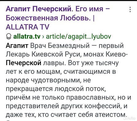 Святая Икона Агапит Печерский, Первый Лекарь Киевской-Руси!.(Написана На Дереве Маслом и Сусальным Золотом Мастером Киево Печерской Лавры!).ИКОНА БЫЛА КУПЛЕНА ДАВНО В г.КИЕВ КИЕВО ПЕЧЕРСКОЙ ЛАВРЫ В 2001г..В НАЧАЛЕ БЫЛА КУПЛЕНА (ИМЕННО ТОЛЬКО С ТАКИМИ НЕ БОЛЬШИМИ РАЗМЕРАМИ БЫЛО ПОЗВОЛЕНО ПРИЛОЖИТЬ И ПРИКОСНУТЬСЯ! К СВЯТЫМ!!!).А ПОСЛЕ УЖЕ Прикладывалась, Прикасалась ко всем МОЩАМ в пещерах в Киево-Печерской Лавре!!! к всем Святым Мощам в Дальних и Ближних Лаврах, Илья Муромца и дальше и дальше ко всем Святым до конца!.. Икона так же Прикасалась к Всем Святым Мироточевых Глав!!!..И Святое Масло Мироточевых Глав именно из тех колбах к которым Прикасалась эта Святая Икона!!!🙏.(Кассета была куплена к этому там же!..И "Квиток" Сохранился и выдавался к Иконе для таможни!). Святая Икона и Святое Масло Мироточевых Глав всегда находятся Много Лет в своей закрытой коробочке!..По рукам не ходили, находятся всегда у одного хозяина!!!. КОНЕЧНО ЭТО БУДЕТ БЕСЦЕННО И ВАЖНО! ДЛЯ ТЕХ КТО ЭТО ПОНИМАЕТ НА ДУХОВНО-ТОНКОМ ПЛАНЕ! ВЕРЫ СИЛЫ ВСЕХ СВЯТЫХ!!!.(ИКОНА НЕ ПРОСТАЯ!, НЕ ПРОСТО ОБРАЗ!) ОНА УЖЕ НЕСЁТ НА СЕБЕ "СВЯЗКУ" С ПЕЩЕРАМИ ЛАВР И ЧАСТИЧКИ ЭНЕРГИЙ ВСЕХ СВЯТЫХ К КОТОРЫМ ПРИКЛАДЫВАЛАСЬ!☝️..Если кто нашёл время прочитать полностью до конца!.Буду Благодарен если напишите Ваши взгляды на сколько ли каждый Верующий хочет иметь эту Святую Икону с Маслом Мироточевых Глав у себя дома и на сколько она может быть бесценна для него???..👉(Если кто готов приобрести только вместе Святую Икону и Святое Масло, Всё обсуждается!. Пишите!..Так же можно всё Обсудить и задать вопросы на (Avito) где они уже стоят на продаже!)👈..Всем Добра и Духовного Процветания!🙏