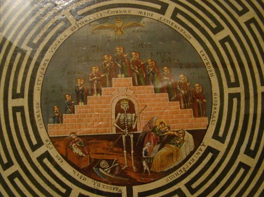 В центре иконы изображен лабиринт из 12 кругов, из которого два входа ведут вверх, в жизнь вечную, и двенадцать – вниз, в геенну огненную. Внутри лабиринта – круг, где представлены начало и конец пребывания человека на земле. Жизненный путь человека изображен как ступенчатая лестница, по которой поднимаются и спускаются мужчина и женщина. На первой ступени они еще дети, на последней – глубокие старики. Указан возраст – 1 год и 90 лет. На смертном одре – в центре справа – душу человека принимает Ангел. Но тут же и стоит бес со списком грехов усопшего.