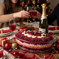 Бордово-желто-оранжевая феерия! Но как же её не попробовать? Казалось бы, ничего особенного: вареные картошка, морковка, свёкла, да ещё солёная рыба. Всё это уложено слоями и пропитано майонезом. Но какой изысканный вкус! Только в русской кухне есть такое блюдо «Селёдка под шубой»! Иностранцам долго приходиться объяснять, что название – это аллегория. Ведь нет ничего такого в кушанье, что напоминало бы собой мех. И селёдке нужно меховое пальто также как и зонтик. Зато можно включить фантазию и наслаждаться салатом. А если «Селёдку под шубой» украсить цветами из солёного огурца или моркови, разложить по периметру кусочки варёного яйца и написать сверху майонезом дату Нового Года – получится просто шедевр!