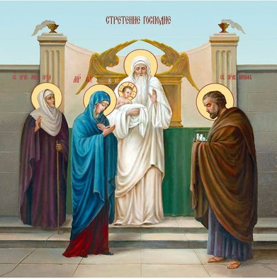 «И пришёл он по вдохновению в храм. И, когда родители принесли Младенца Иисуса, чтобы совершить над Ним законный обряд», От Луки 2:27. По Закону родители приносили младенца-первенца в храм и благодарили Бога за дарование им ребёнка. Старец Симеон ожидал встречи со Христом долгие годы и вот, наконец, она свершилась: «он взял Его на руки, благословил Бога и сказал: Ныне отпускаешь раба Твоего, Владыко, по слову Твоему, с миром», От Луки 2:28, 29. Праведный Симеон возблагодарил Бога за то, что увидел Иисуса Христа и взял Его на руки, он знал, что скоро умрёт, но Симеон принял это обстоятельство жизни с радостью. Старец умер с миром в душе. И первым сказал, что через младенца-Христа даровано Спасение для Израиля и всех народов: «ибо видели очи мои спасение Твоё, которое Ты уготовал пред лицем всех народов, свет к просвещению язычников и славу народа Твоего Израиля», От Луки 2:30-32, что весь мир просветит Свет Истинной Веры.