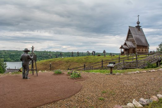 Художественное полотно изображает высокий берег озера, огромное прекрасное небо в часы заката с бледно-лиловыми облаками и маленькую деревянную церквушку, одиноко стоящую на берегу. Рядом с церковью старое кладбище с покосившимися от времени деревянными крестами.