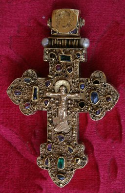Небольшой крест был изготовлен в 1710 г. и в конце ХVIII в. передан князьями Шаховскими царствующему Дому Романовых. Он спаян из нескольких частей. Две основные пластины, лицевая и задняя, вырезаные в виде креста размером в высоту около 14 см и в длину около 9 см, соединены по периметру золотой полосой шириной около 1, 5 см. Крест — четырехконечный; основание его имеет форму пятилистника, правый и левый концы — форму трилистника. Сверху к кресту крепится на специальном шарнире, украшенном жемчугом, подвижная часть в виде квадрата-мощевика с отверстиями-углублениями в торцах. Крест предназначен для ношения на груди. На лицевой части навершия выгравировано изображение Спаса Нерукотворного. Образ Спаса Нерукотворного украшен двумя драгоценными камнями, расположенными в нижних Углах квадрата. Передняя пластина самого креста украшена золотой филигранью. В центре — небольшое отлитое изображение Распятия. В изгибах золотой скани размещаются драгоценные камни, среди которых есть рубины и изумруды. На нижнем пятилистнике — шесть обрамленных золотом драгоценных камней, расположенных по кругу, в центре которого находится седьмой камень — крупный изумруд; на боковых трилистниках — по пять драгоценных камней-украшений, расположенных тоже по кругу, в центре которого изумруды такого же размера, что и в нижней части креста; верхняя часть креста-мощевика украшена четырьмя вкрапленными в литье драгоценными камнями, в центре которых — тоже изумруд. Все изумруды примерно одинакового достоинства. На обратной стороне креста (задняя пластина) выгравированы по-церковнославянски имена сорока угодников Божиих, частички коих хранятся в самом кресте-мощевике: