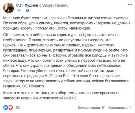 Мне надо будет составить список либеральных риторических приемов. По пока обращусь к самому, кажется, популярному - Церковь не должна порицать аборты, потому что Костры Инквизиции.