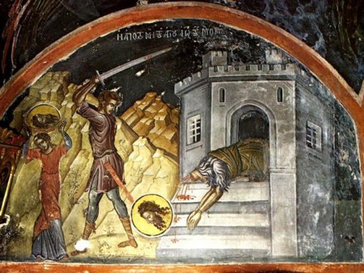 Евангельское повествование содержит подробное описание убийства Иоанна Предтечи (Мф. 14:1–12; Мк. 6:14–29). По велению царя Ирода Антипы пророк Божий был посажен в темницу за открытое обличение Его Величества в незаконном сожительстве с Иродиадой, женой его брата Филиппа. И тем не менее царь Ирод почтительно относился к Иоанну Крестителю, о чем свидетельствует евангелист Марк: «Ибо Ирод боялся Иоанна, зная, что он муж праведный и святой, и берег его; многое делал, слушаясь его, и с удовольствием слушал его» (Мк. 6:20). Безнаказанные обличения Иоанна Крестителя и нерешительность Ирода так обозлили Иродиаду, что она замыслила в сердце своем погубить праведника. Вскоре представился и удобный случай – царский пир. По наущению Иродиады ее дочь развлекала царя сладострастными танцами и так преуспела в своем мастерстве, что восторженный царь дал клятвенное обещание выполнить любое ее желание. Злоба и ненависть распутной Иродиады затмили ее разум, и она неистово требовала от дочери просить главу Иоанна. «Царь опечалился, но ради клятвы и возлежавших с ним не захотел отказать ей» (Мк. 6:26). Честная глава величайшего пророка пала под мечом палача.