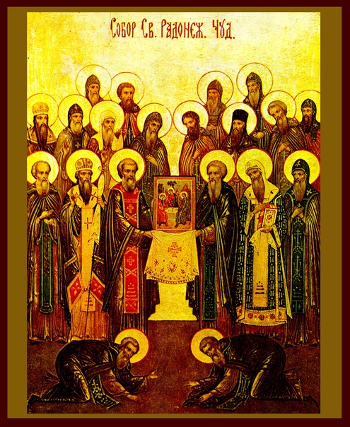 Днесь светло празднуем, вернии людие,/ преславныя Троицкия обители торжество:/ се бо велий собор святых чудотворцев Радонежских,/ яко дивныя птицы небесныя,/ являет нам Церковь Российская,/ стезями честнаго их жития шествовати всех призывающи,/ к нимже, с верою и любовию притекающе, воззовем:/ молите...