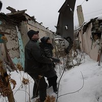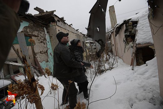 Вместе с супругами мы заехали проверить их первый дом. Развалины разрушенной комнаты занесло снегом. Впрочем, здесь эта картина типичная. Нет практически ни одного строения без попаданий. Тут и там — свежие воронки расплескались вывернутой наружу черной землей. Электрики в люльке в который раз натягивают сорванные провода. Что-то грохочет в стороне Песок и Спартака. Но наши собеседники даже не вздрагивают, просто не обращают внимания.