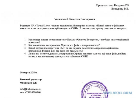 С таким официальным запросом в Госдуму к спикеру Вячеславу Володину обратилось Уральское издание. Согласно сообщению СМИ, запрос был направлен в нижнюю палату, чтобы уточнить: не будет ли считаться фейковой – новость с упоминанием пасхального приветствия «Христос воскресе»?
