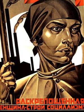 Плакат: Раскрепощённая женщина - строй социализм!"Международный женский день" – революционный праздник женщин-интернационалисток, установленный по инициативе К. Цеткин на социалистической конференции в Копенгагене в марте 1910 г. Он изначально был задуман как праздник женщины-революционерки, а не просто женщины. Быть революционером тогда означало: бороться против Бога, Царя и Отечества – за Интернационал.