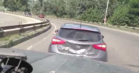 Заметив наше повышенное внимание к ним, водитель стал вести себя крайне агрессивно: подрезал, притирал к обочине, встраивался перед нами, оттормаживаясь. Резко затормозив перед нами, он таки совершил контакт.